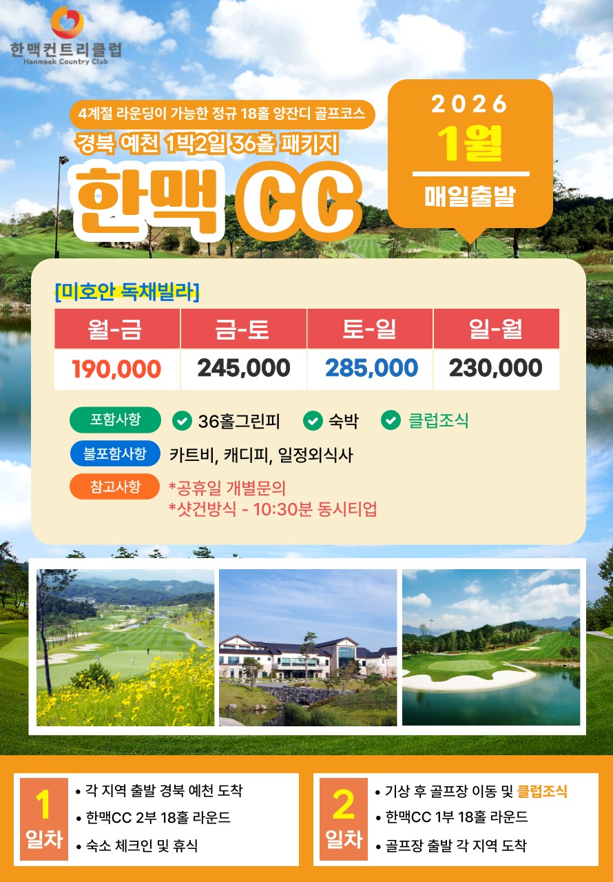 💥 한맥CC 1박2일 자차골프 패키지💥