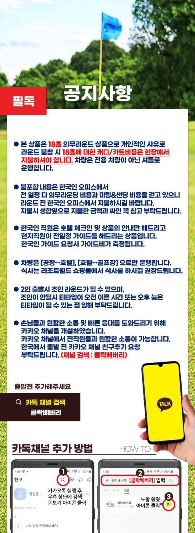 ● 본 상품은 18홀 의무라운드 상품으로 개인적인 사유로 라운드 불참 시 18홀에 대한 캐디/ 카트비 용은 현장에서 지불하셔야 합니다. 이점 양해해 주시기 바랍니다.
